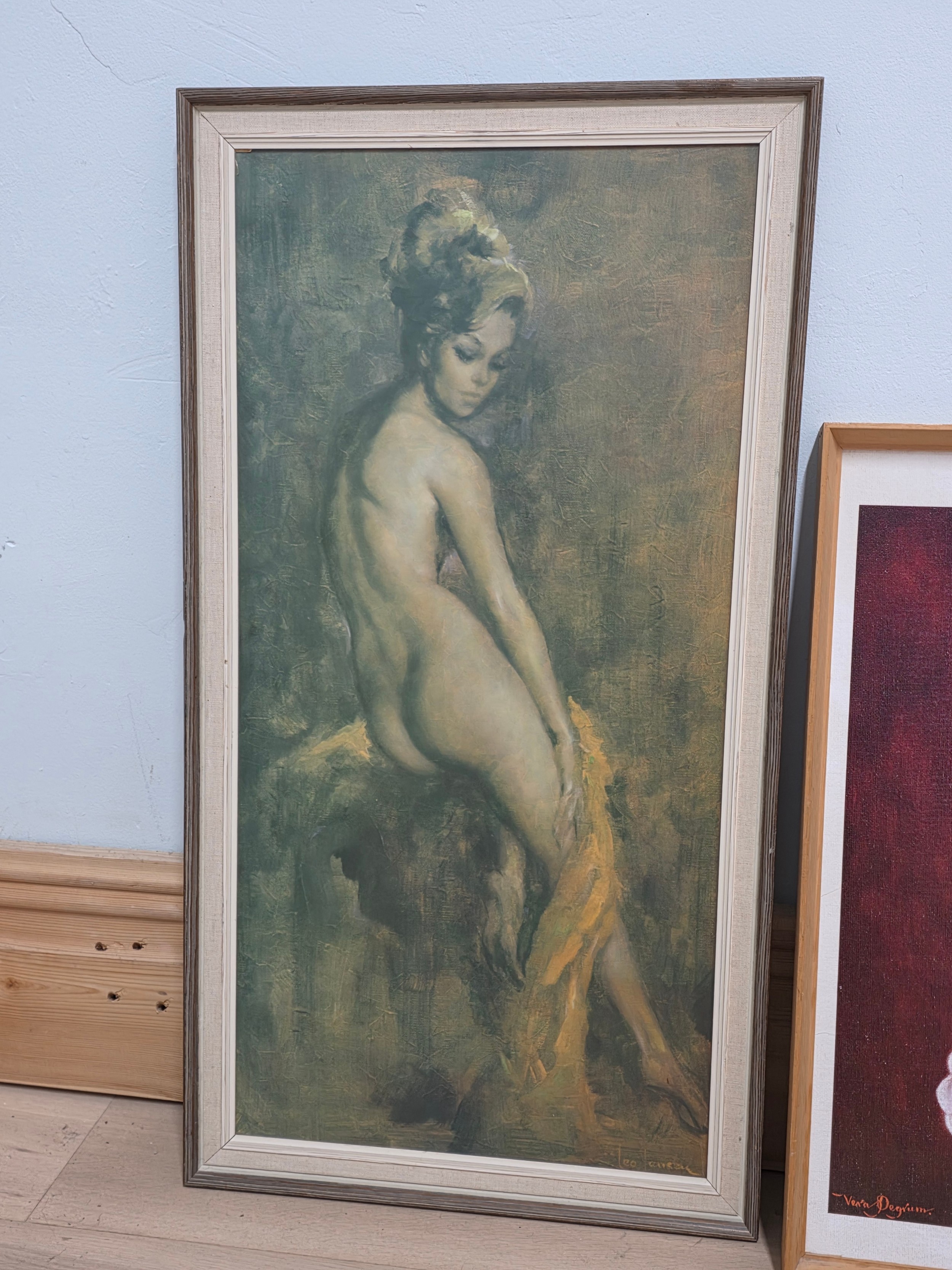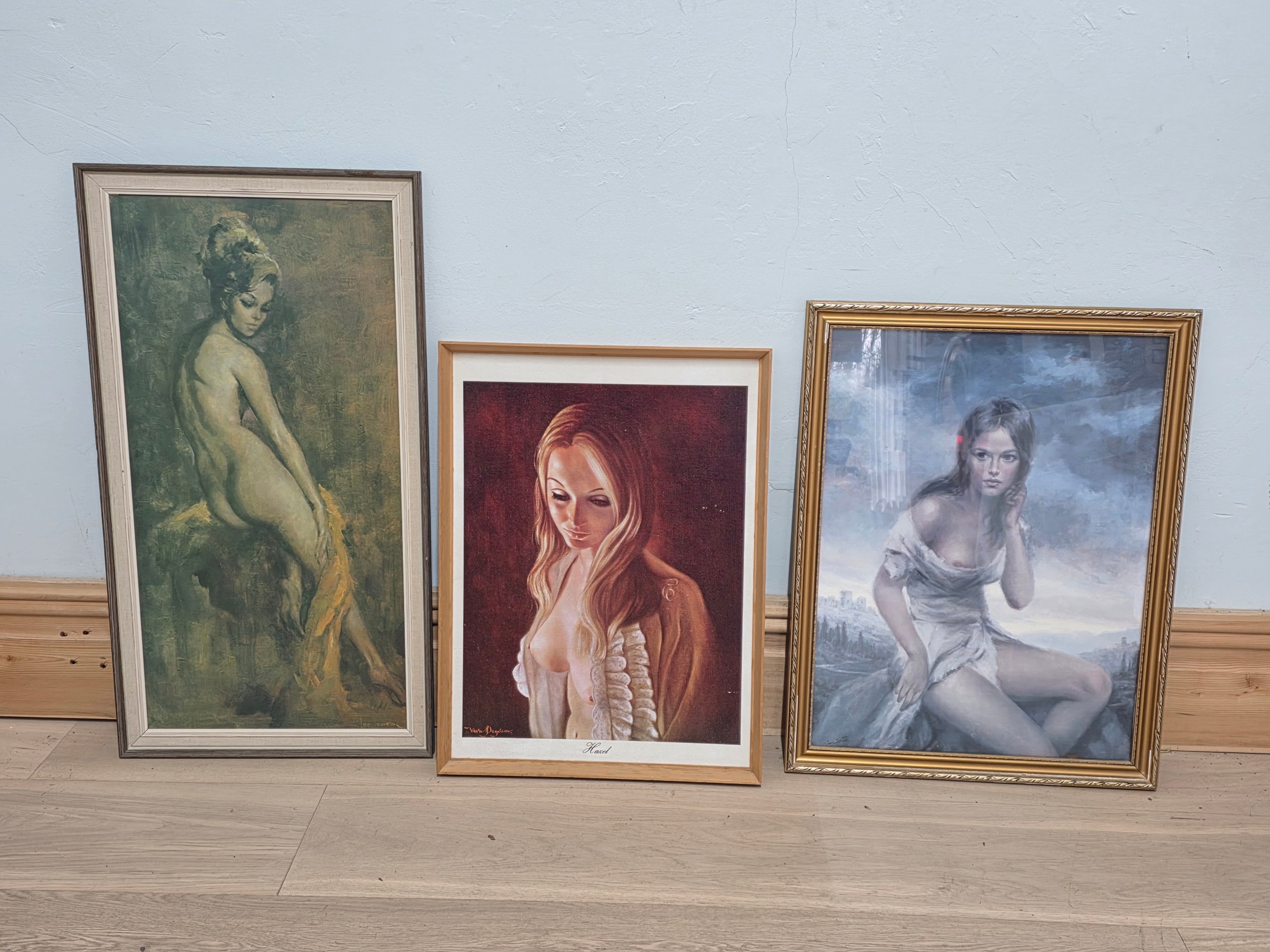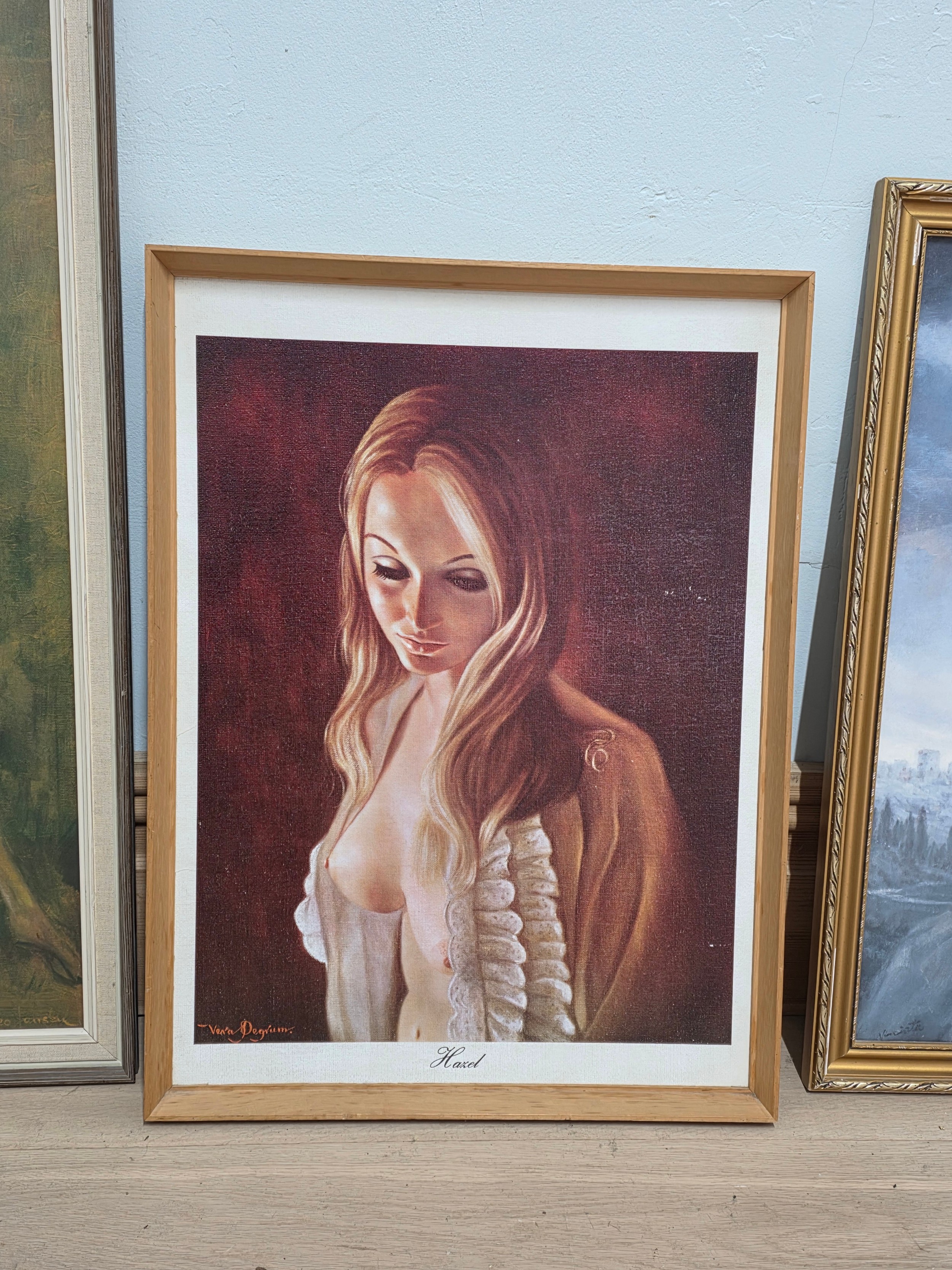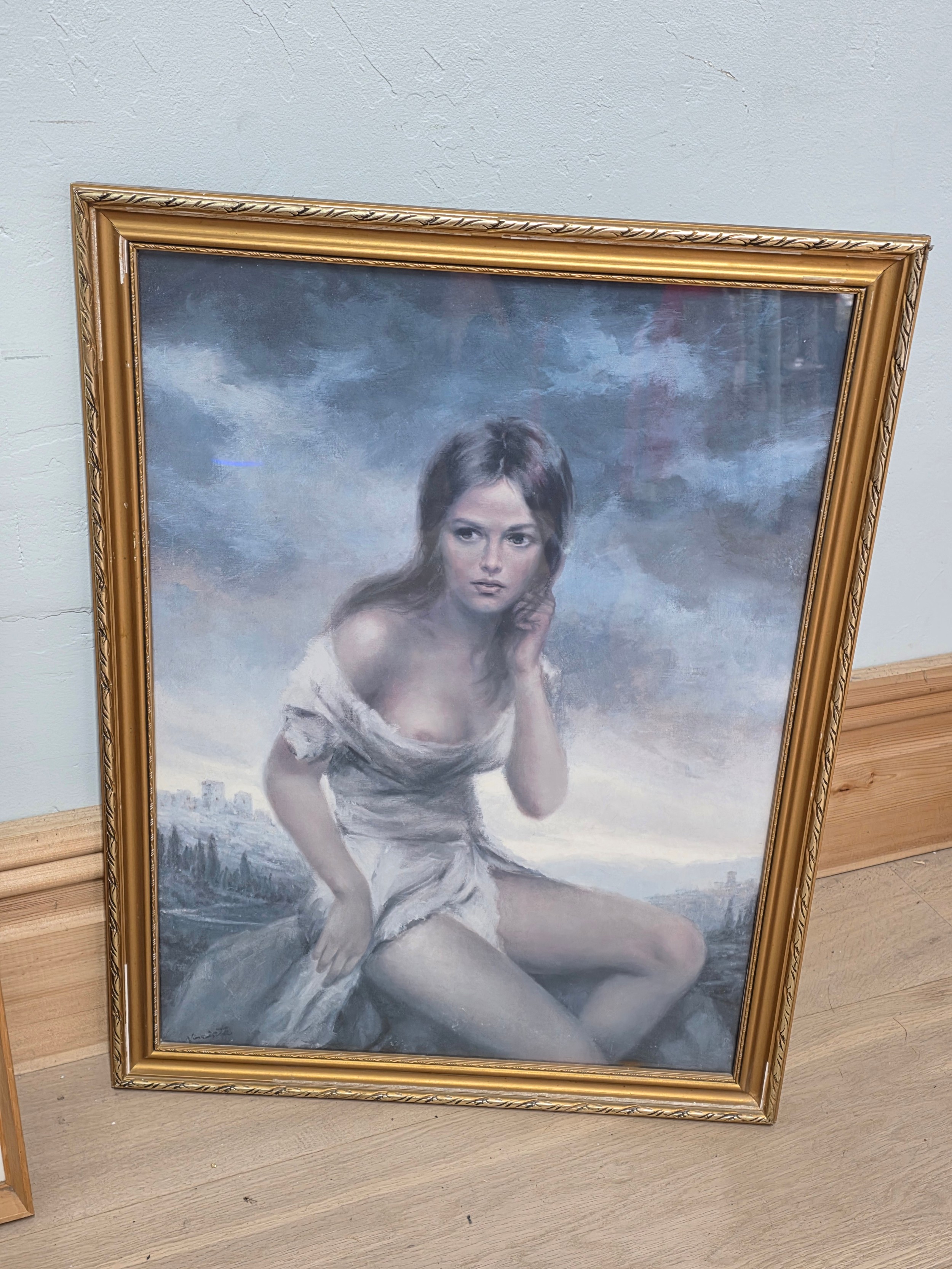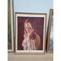 A quantity of three mid century framed prints to include Broken Silence by Vinciata ( 52cm x 67cm) A Leo Jansen print ( 44cm x 83cm ) and a Hazel print by Vera Pegrum ( 46cm x 61cm )